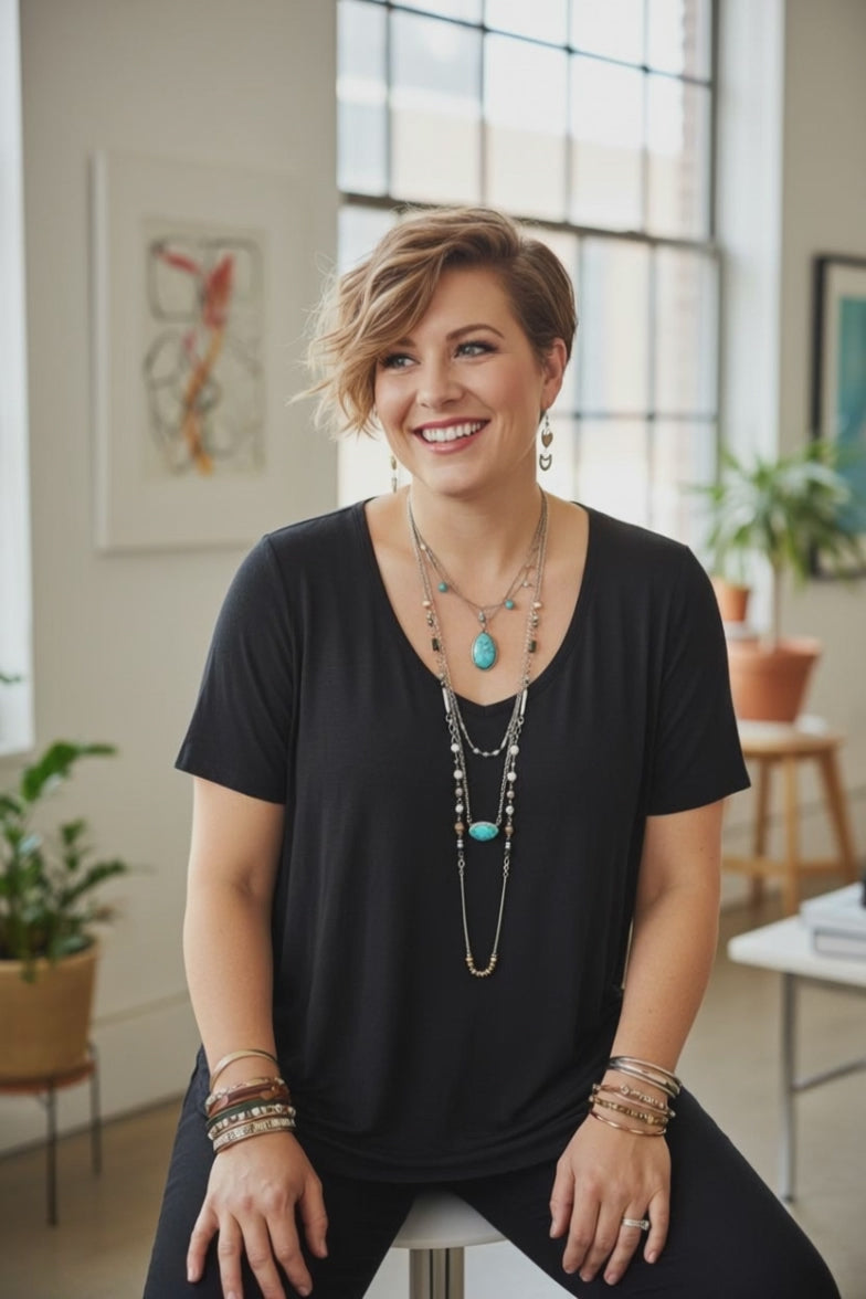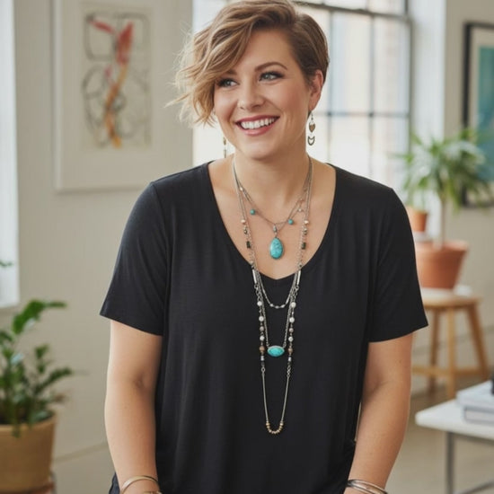 This lightweight tee features a relaxed silhouette with a softly draped feel. The classic black tone makes it endlessly versatile, while the scoop neckline and curved hem create a flattering shape whether worn tucked or loose. The soft rayon blend offers gentle stretch and comfort, making this an easy piece to reach for throughout the day.