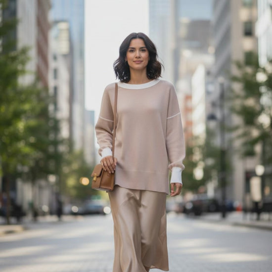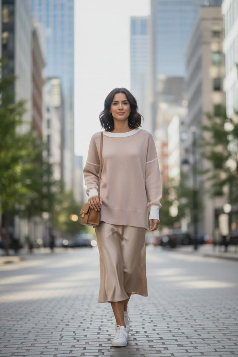 This sweater features a warm tan body balanced by crisp white detailing at the cuffs and neckline. The relaxed silhouette drapes naturally through the body, while subtle side vents add ease and movement along the hem. Clean seaming and thoughtful construction bring a polished finish to this otherwise effortless piece, making it equally suited for layering or wearing on its own.